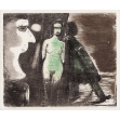 Xilogravura aquarelada.