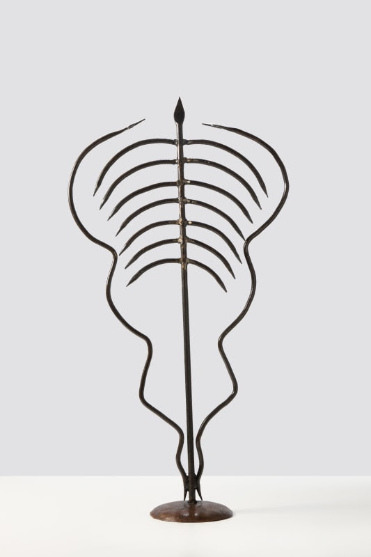 José Adário (1947) nasceu no bairro de Caixa d’Água, em Salvador, na Bahia. Foi iniciado aos 11 anos de idade no trabalho de ferreiro de candomblé pelo seu mestre e mentor Maximiano Prates, cuja oficina, situada na histórica Ladeira da Conceição da Praia, foi passada para Adário, que ali trabalha até hoje. As ferramentas de santo, esculturas de ferro que operam, no candomblé, uma espécie de mediação entre os homens e os orixás, entre o mundo físico – Aiyê – e o mundo espiritual – Orum -, são utilizadas nos terreiros em rituais e para devoção. Por produzi-las com grande sofisticação formal e originalidade, José Adário, também chamado de Zé Diabo, passou a ser reconhecido não só como o escultor-ferreiro mais celebrado dos terreiros de candomblé da Bahia, mas como um artista cuja prática é intimamente vinculada às raízes afro-diaspóricas da cultura de sua região – lembremos que Salvador é considerada a cidade mais negra fora da África.